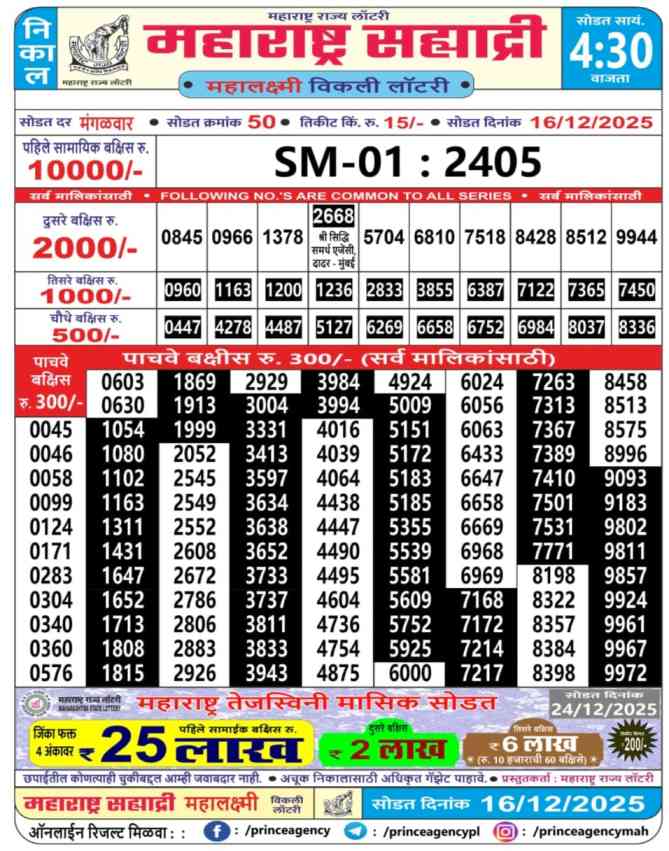Maharashtra State Sahyadri Mahalaxmi Weekly Lottery ticket is only Maharashtra Sahyadri Weekly rupees 15 for 1 ticket, but 10 thousand is given as prize for winning the major. Results are also placed on this page which you can see Sahyadri Mahalaxmi Weekly Lottery Result today 16.12.2025 is searched by different names, Maharashtra State Sahyadri Mahalaxmi Weekly Lottery Result 4:30PM, Maharashtra State lottery 4:30PM result , Maharashtra State Lottery today Sahyadri Mahalaxmi Weekly lottery result, Maharashtra Sahyadri Mahalaxmi Lottery Result, Maharashtra State Sahyadri Mahalaxmi Weekly lottery result 2025, Sahyadri Mahalaxmi Weekly lottery result 4:30PM, Maharashtra State lottery 2025.