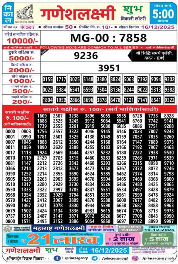 Maharashtra State Ganeshlaxmi Shubh Weekly Lottery ticket is only Maharashtra Weekly rupees 10 for 1 ticket, but 10 thousand is given as prize for winning the major. Results are also placed on this page which you can see Ganeshlaxmi Shubh Weekly Lottery Result today 16.12.2025 is searched by different names, Maharashtra State Ganeshlaxmi Shubh Weekly Lottery Result 05:00pm, Maharashtra State lottery 05:00pm result , Maharashtra State Lottery today Ganeshlaxmi Shubh Weekly lottery result, Maharashtra Ganeshlaxmi Shubh Lottery Result, Maharashtra State Ganeshlaxmi Shubh Weekly lottery result 2025, Ganeshlaxmi Shubh Weekly lottery result 05:00pm, Maharashtra State lottery 2025.