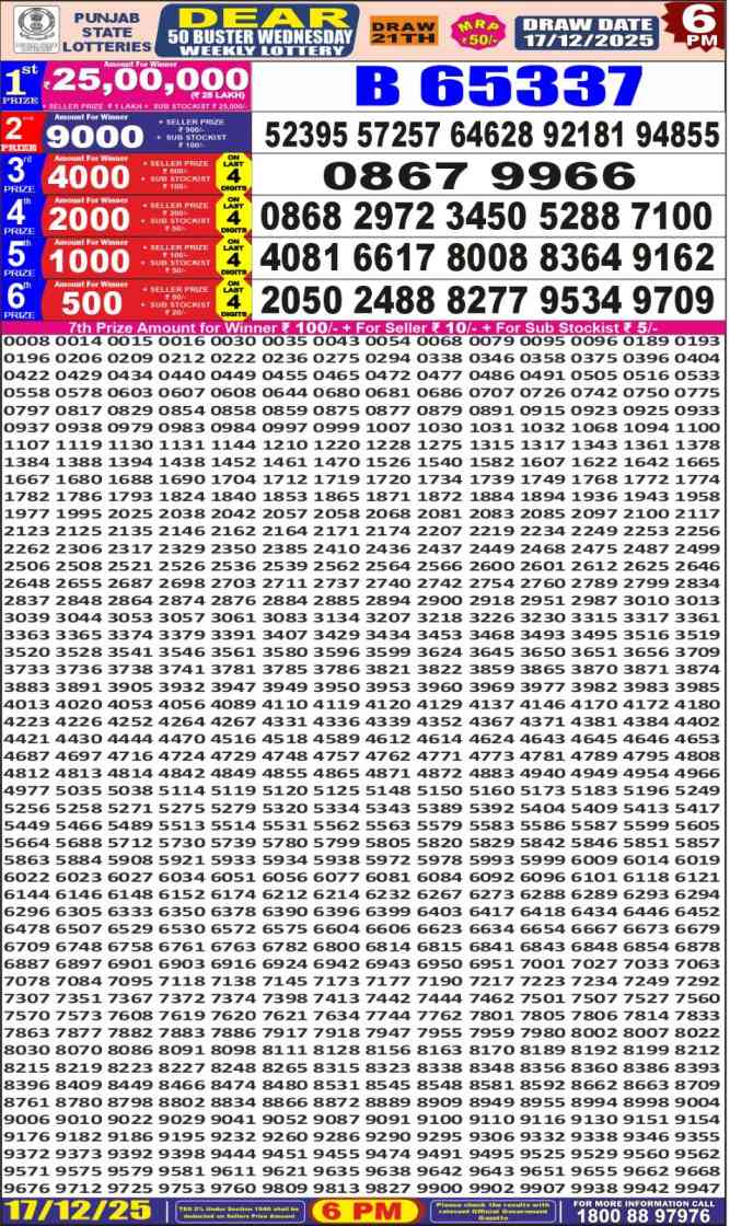 Punjab State Lottery 17.12.2025 Today Result is Punjab State Dear 50 Buster Wednesday Weekly lottery Result draw whose Punjab lottery result is published a day. Mainly Punjab State Lottery is 6:00 pm Punjab State Lottery but being combined with lottery sambad, Punjab State Lottery will release the results of 06:00pm is published.