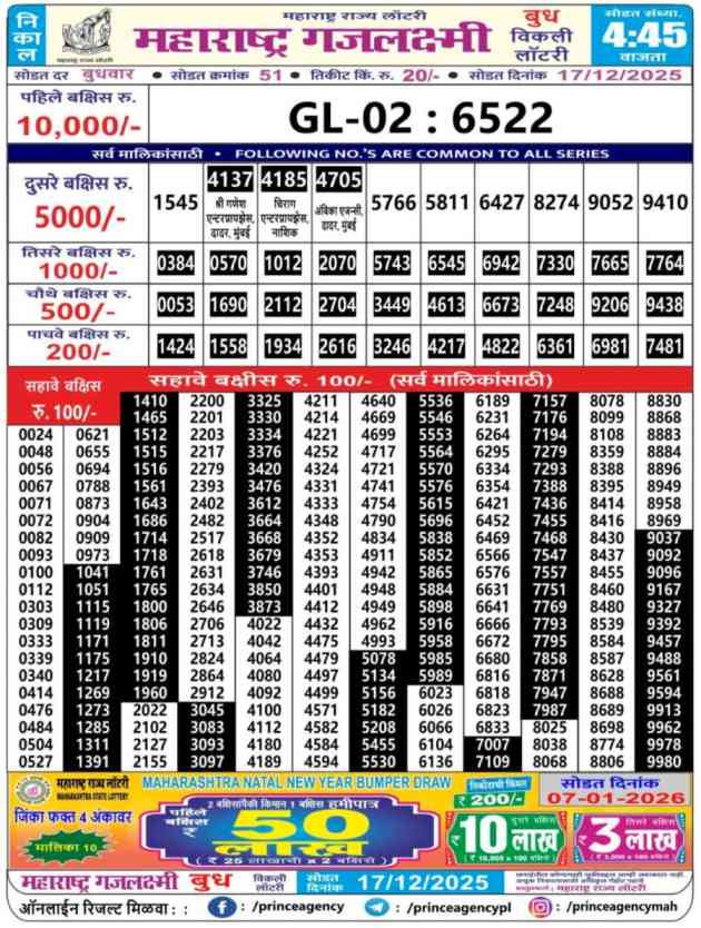 Maharashtra State Lottery declares many bumper results. Gajlaxmi Budh Weekly Lottery Result 2025 is Maharashtra State Lottery at 04:45 PM whose result gets published on the page around 05:30 PM. Maharashtra State Lottery Result ,17.12.2025 Gajlaxmi Budh Weekly Result, Gajlaxmi Budh Result Today Live 4:45PM, Maharashtra Gajlaxmi Budh Weekly Result 4:45PM, Maharashtra State Gajlaxmi Budh Weekly Result, Maharashtra State lottery result 4:45PM, Gajlaxmi Budh Weekly Result, Gajlaxmi Budh Weekly result, Maharashtra lottery result today 4:45PM, Gajlaxmi Budh Lottery 4:45 PM result 17.12.2025, Maharashtra Gajlaxmi Budh Weekly Lottery Result, Gajlaxmi Budh Live Draw.