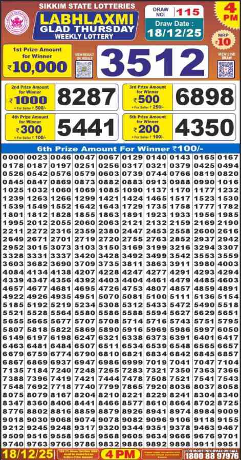 Sikkim State Lottery declares many bumper results. Labh laxmi Thursday Weekly Lottery Result 18.12.2025 is Sikkim State Lottery at 04:00 PM whose result gets published on the page around 04:12 PM. Sikkim State Lottery Result , Labh laxmi Glad Result, Labh laxmi Thursday Result Today Live 4PM, Sikkim Labh laxmi Weekly Result 4PM, Sikkim State Labh laxmi Glad Thursday Result, Sikkim State lottery result 4PM, Labh laxmi Thursday Weekly Result 18.12.2025, Labh laxmi Glad result, Sikkim Labh laxmi 4 PM Result, Sikkim lottery result today 4PM, Labh laxmi Thursday Lottery 4 PM result , Sikkim Labh laxmi Thursday Weekly Lottery Result, Sikkim Labh laxmi Thursday Live 18.12.2025 Draw.