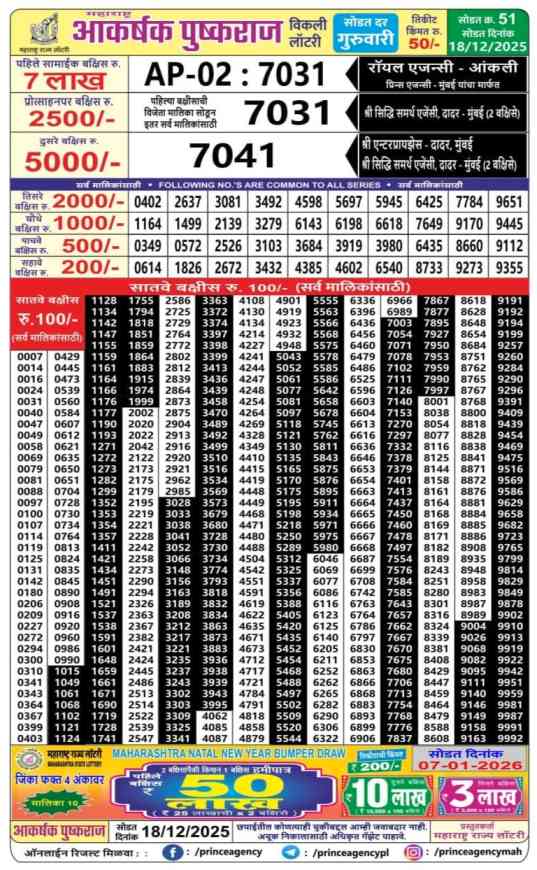 Download Maharashtra State Lottery 18.12.2025 Today 4:15pm Result from here. Maharashtra State Akarshak Pushkraj Weekly Lottery Result Important Lottery of Maharashtra State which is legally operated by the State Government there. You are satisfied to get the Result of Maharashtra Akarshak Pushkraj Lottery Draw at 04:15pm on this webpost Today’s lottery result of Maharashtra State Lottery 4:15pm is published here.