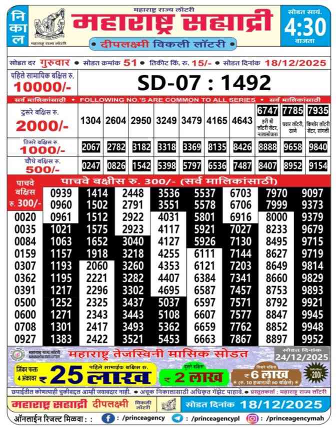 | Maharashtra State Sahyadri Deeplaxmi Weekly Lottery 18.12.2025 Result | Maharashtra State Lottery 4:30pm Result | Maharashtra State Sahyadri Deeplaxmi Weekly Lottery Result Today 04:30pm| Maharashtra State Lottery Result 04:30pm Today Live Draw | Maharashtra State Lottery | Check Maharashtra Sahyadri Deeplaxmi Weekly Weekly Lottery Result | |