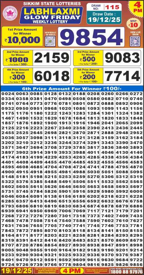 Sikkim State Lottery declares many bumper results. Labh laxmi Friday Weekly Lottery Result 2025 is Sikkim State Lottery at 04:00 PM whose result gets published on the page around 04:12 PM. Sikkim State Lottery Result ,19.12.2025 Labh laxmi Glow Result, Labh laxmi Friday Result Today Live 4PM, Sikkim Labh laxmi Weekly Result 4PM, Sikkim State Labh laxmi Glow Friday Result, Sikkim State lottery result 4PM, Labh laxmi Friday Weekly Result, Labh laxmi Glow result 4pm, Sikkim lottery result today 4PM, Labh laxmi Friday Lottery 4 PM result 19.12.2025, Sikkim Labh laxmi Friday Weekly Lottery Result, Labh laxmi Friday Live Draw.
