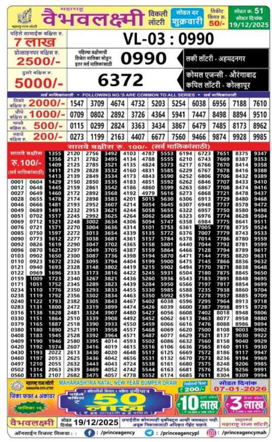 MAHARASHTRA VAIBHAV LAXMI LOTTERY 2025 DRAW DATE- 19.12.2025