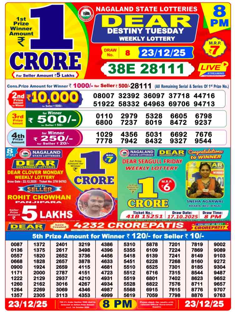 Nagaland lottery ticket is only 7 rupees but 1 crore is given as prize for winning the major. Results are also placed on this page which you can see. Nagaland lottery sambad is searched by different names, lottery sambad 8pm result, lottery sambad night result, night result 8pm, nagaland state lottery 8pm result, nagaland state lottery sambad 8pm Result, Nagaland State Lotteries, Nagaland State Lottery Result 8pm, 6pm, 1pm, Nagaland State Lottery Live, Nagaland Lotteries, Nagaland State Lottery Evening Result, Nagaland State Lottery Old Result, Lottery Sambad Old, Nagaland Lottery Sambad Night Result Live 8PM, Nagaland Lottery Sambad Result Live 6PM, Nagaland State Lottery Sambad Morning Result Live 1PM.