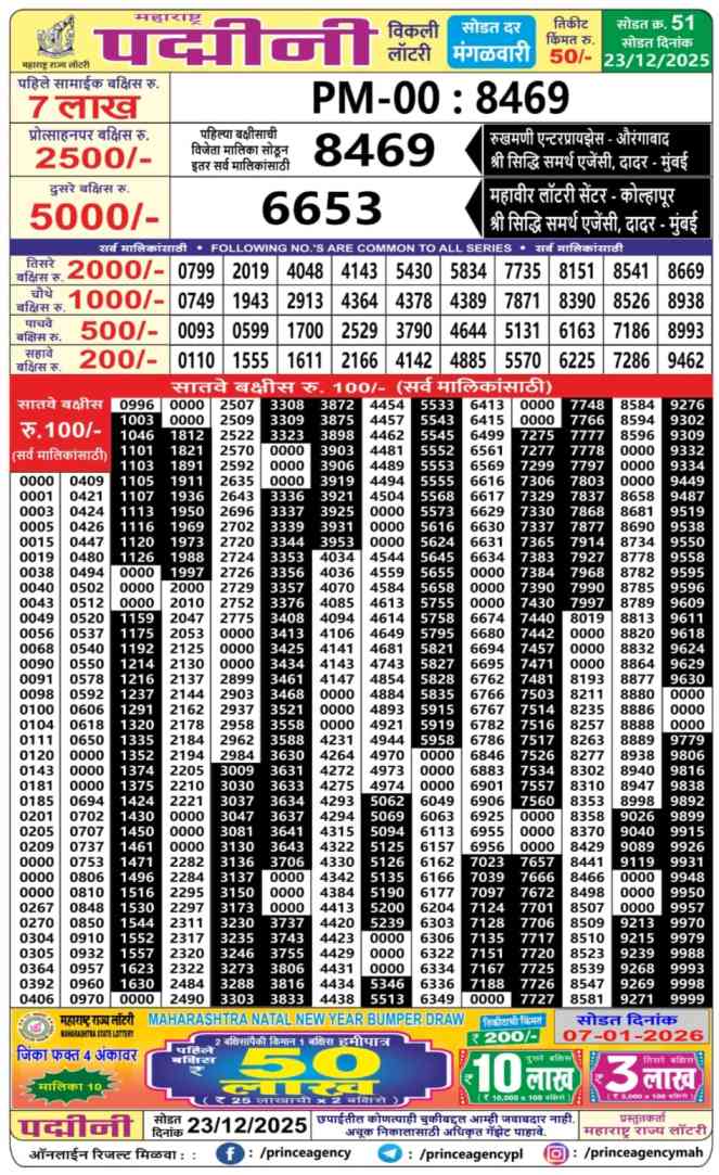 Maharashtra State Lottery declares many bumper results. Maharashtra Padmini  2025 Result is Maharashtra State Lottery at 04:15 PM whose result gets published on the page around 05:00 PM. Maharashtra State Padmini Weekly Lottery Result 23.12.2025 Live Draw Winner List at 4.15 PM, Maharashtra Dear Padmini Lottery 2025, Today Maharashtra Padmini Lottery, Maharashtra State Lottery Padmini Lottery Result Today Live, Maharashtra Padmini Draw 2025, Maharashtra Lottery Padmini Result 2025, Maharashtra Lottery 2025, Maharashtra State Lottery Result 2025, Maharashtra Padmini Lottery 23.12.2025 Result.