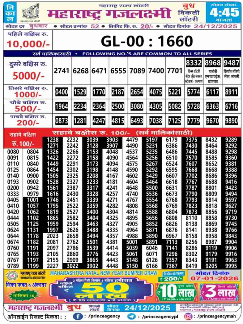 Maharashtra State Lottery declares many bumper results. Gajlaxmi Budh Weekly Lottery Result 2025 is Maharashtra State Lottery at 04:45 PM whose result gets published on the page around 05:30 PM. Maharashtra State Lottery Result ,24.12.2025 Gajlaxmi Budh Weekly Result, Gajlaxmi Budh Result Today Live 4:45PM, Maharashtra Gajlaxmi Budh Weekly Result 4:45PM, Maharashtra State Gajlaxmi Budh Weekly Result, Maharashtra State lottery result 4:45PM, Gajlaxmi Budh Weekly Result, Gajlaxmi Budh Weekly result, Maharashtra lottery result today 4:45PM, Gajlaxmi Budh Lottery 4:45 PM result 24.12.2025, Maharashtra Gajlaxmi Budh Weekly Lottery Result, Gajlaxmi Budh Live Draw.