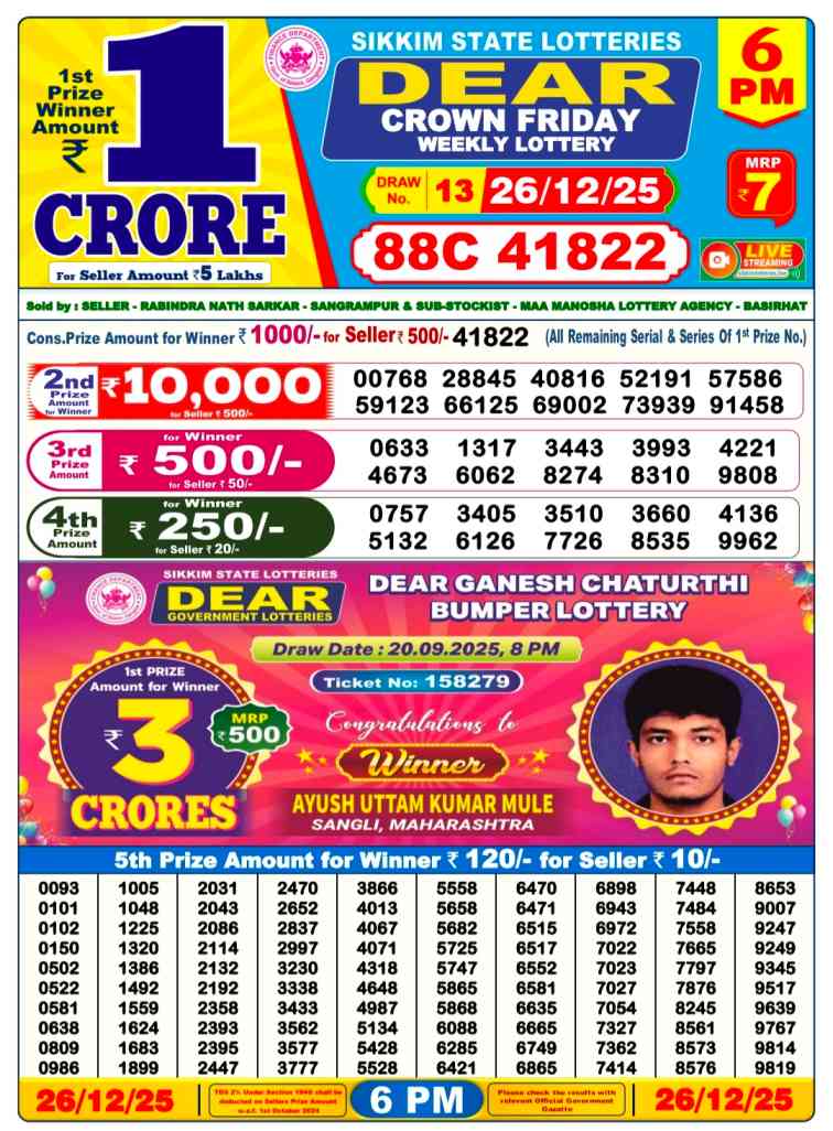 The Sikkim State Lottery Sambad Result is published by Sikkim State at 1pm, 6pm, 8pm. Which regularly publishes the lottery results weekly and thrice a day.