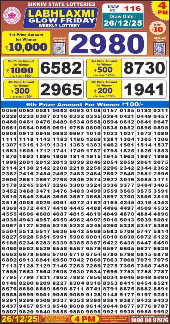 Sikkim State Lottery declares many bumper results. Labh laxmi Friday Weekly Lottery Result 2025 is Sikkim State Lottery at 04:00 PM whose result gets published on the page around 04:12 PM. Sikkim State Lottery Result ,26.12.2025 Labh laxmi Glow Result, Labh laxmi Friday Result Today Live 4PM, Sikkim Labh laxmi Weekly Result 4PM, Sikkim State Labh laxmi Glow Friday Result, Sikkim State lottery result 4PM, Labh laxmi Friday Weekly Result, Labh laxmi Glow result 4pm, Sikkim lottery result today 4PM, Labh laxmi Friday Lottery 4 PM result 26.12.2025, Sikkim Labh laxmi Friday Weekly Lottery Result, Labh laxmi Friday Live Draw.