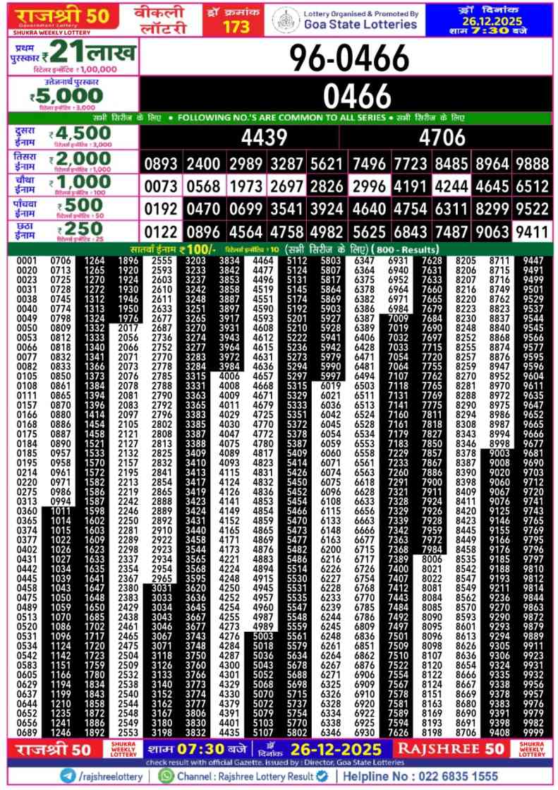 Download Goa Rajshree Lottery 50 Shani 26.12.2025 Today 7:30pm Result from here. Goa Rajshree 50 Weekly Lottery Result Important Lottery of Goa Rajshree which is legally operated by the Rajshree Government there. You are satisfied to Get The Result of 50 Shani weekly Lottery at 07:30pm on this webpost Today’s Lottery Result of Goa Rajshree Lottery 7:30pm is published here.