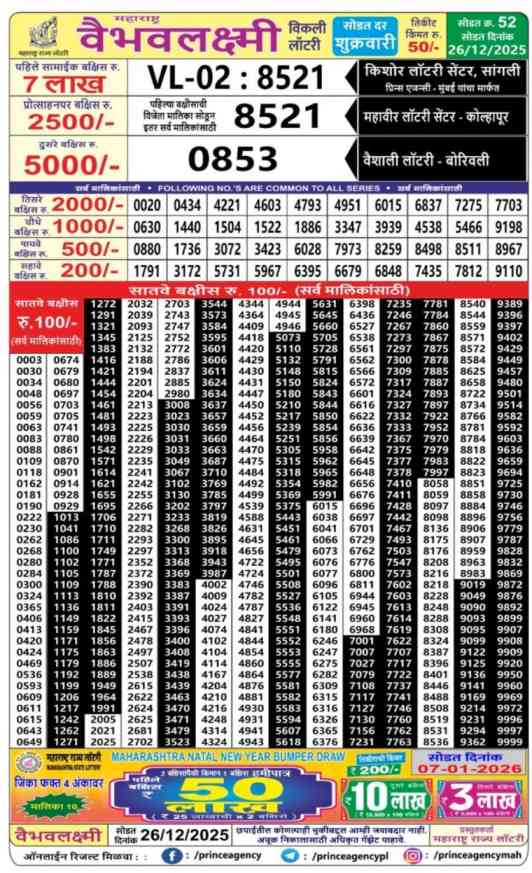 Download Maharashtra State Lottery 26.12.2025 Today 4:15pm Result from here. Maharashtra State Vaibhav Laxmi Weekly Lottery Result Important Lottery of Maharashtra State which is legally operated by the State Government there. You are satisfied to get the Result of Maharashtra Vaibhav Laxmi Lottery Draw at 04:15pm on this webpost Today’s lottery result of Maharashtra State Lottery 4:15pm is published here.