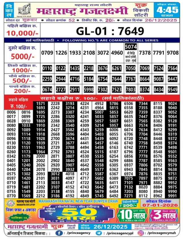 Maharashtra State Lottery declares many bumper results. Gajlaxmi Shukra Weekly Lottery Result 2025 is Maharashtra State Lottery at 04:45 PM whose result gets published on the page around 05:30 PM. Maharashtra State Lottery Result ,26.12.2025 Gajlaxmi Shukra Weekly Result, Gajlaxmi Shukra Result Today Live 4:45PM, Maharashtra Gajlaxmi Shukra Weekly Result 4:45PM, Maharashtra State Gajlaxmi Shukra Weekly Result, Maharashtra State lottery result 4:45PM, Maharashtra Gajlaxmi Shukra Weekly Result, Maharashtra Gajlaxmi Shukra Weekly result, Maharashtra lottery result today 4:45PM, Maharashtra Gajlaxmi Shukra Lottery 4:45 PM result 26.12.2025, Maharashtra Gajlaxmi Shukra Weekly Lottery Result, Maharashtra Gajlaxmi Shukra Live Draw.