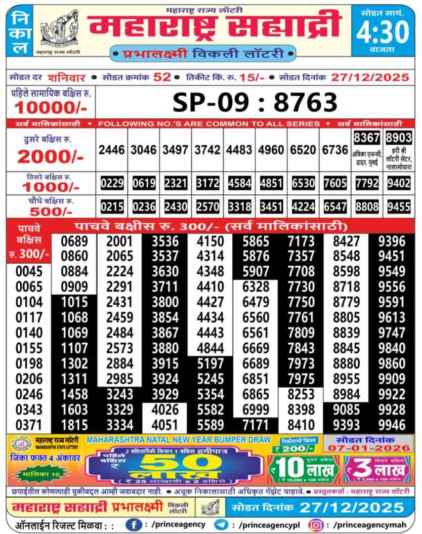 | Maharashtra State Sahyadri Prabhalaxmi Weekly Lottery 27.12.2025 Result | Maharashtra State Lottery 4:30PM Result | Maharashtra State Sahyadri Prabhalaxmi Weekly Lottery Result Today 4:30PM| Maharashtra State Lottery Result 4:30PM Today Live Draw | Maharashtra State Lottery | Check Maharashtra Sahyadri Prabhalaxmi Weekly Weekly Lottery Result | |