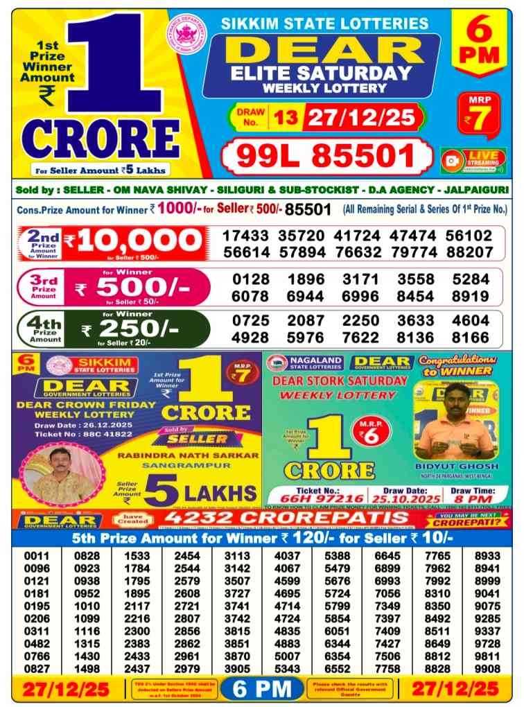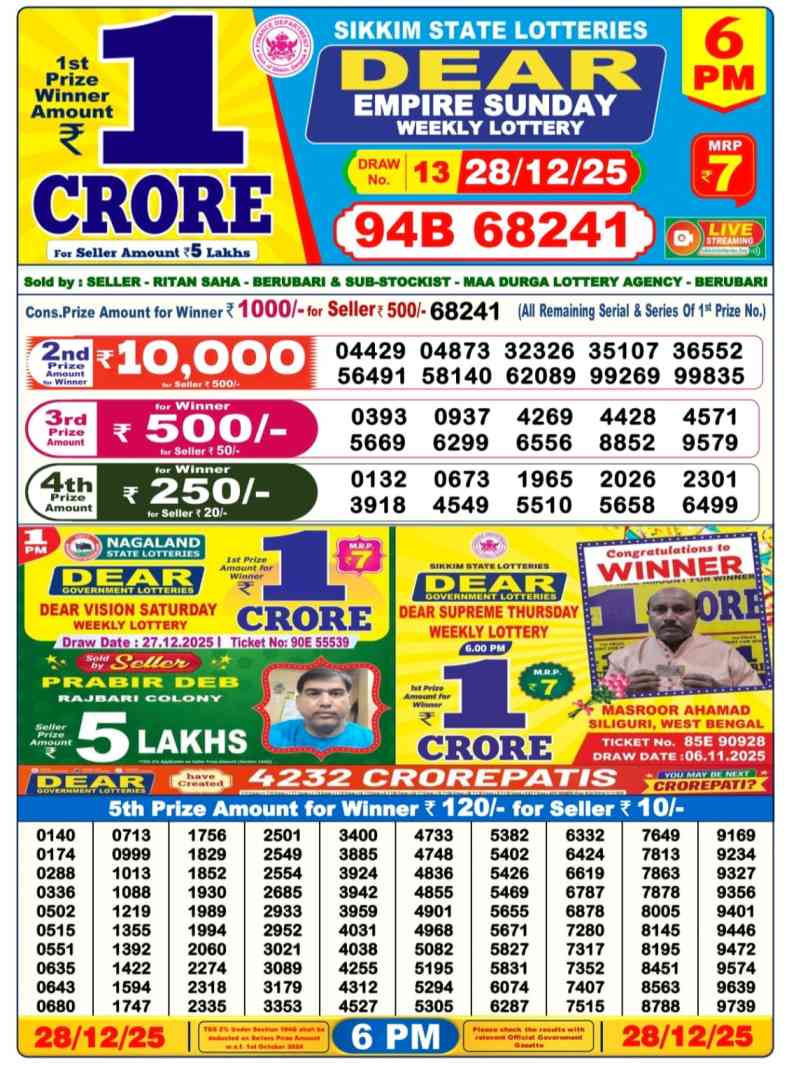 As per the official information provided by the Nagaland State Lotteries, 30.12.2025 Results the winner of today’s Dear First Winner award will receive INR 1 Crore from a ticket worth INR 6. You can check your result from the lotterysambad 30 12 25 link given below…