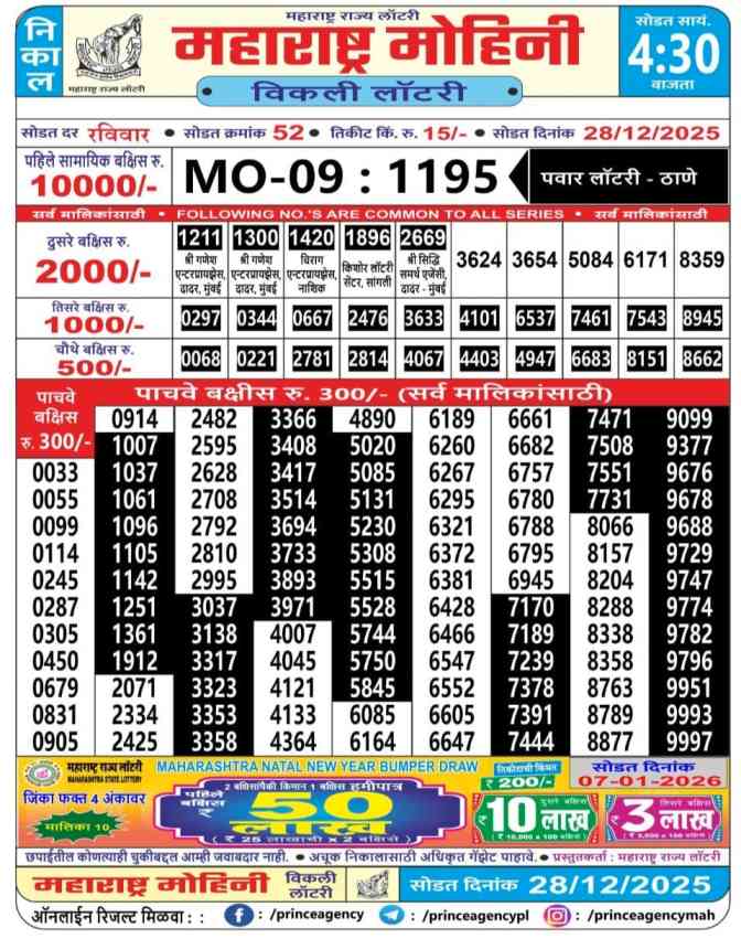 Maharashtra State Lottery declares many bumper results. Maharashtra Mohini 2025 Result is Maharashtra State Lottery at 04:15 PM whose result gets published on the page around 05:00 PM. Maharashtra State Mohini Weekly Lottery Result 28.12.2025 Live Draw Winner List at 4.15 PM, Maharashtra Dear mohini Lottery 2025, Today Maharashtra Mohini Lottery, Maharashtra State Lottery Mohini Lottery Result Today Live, Maharashtra Mohini Draw 2025, Maharashtra Lottery Mohini Result 2025, Maharashtra Lottery 2025, Maharashtra State Lottery Result 2025, Maharashtra Mohini Lottery 28.12.2025 Result.