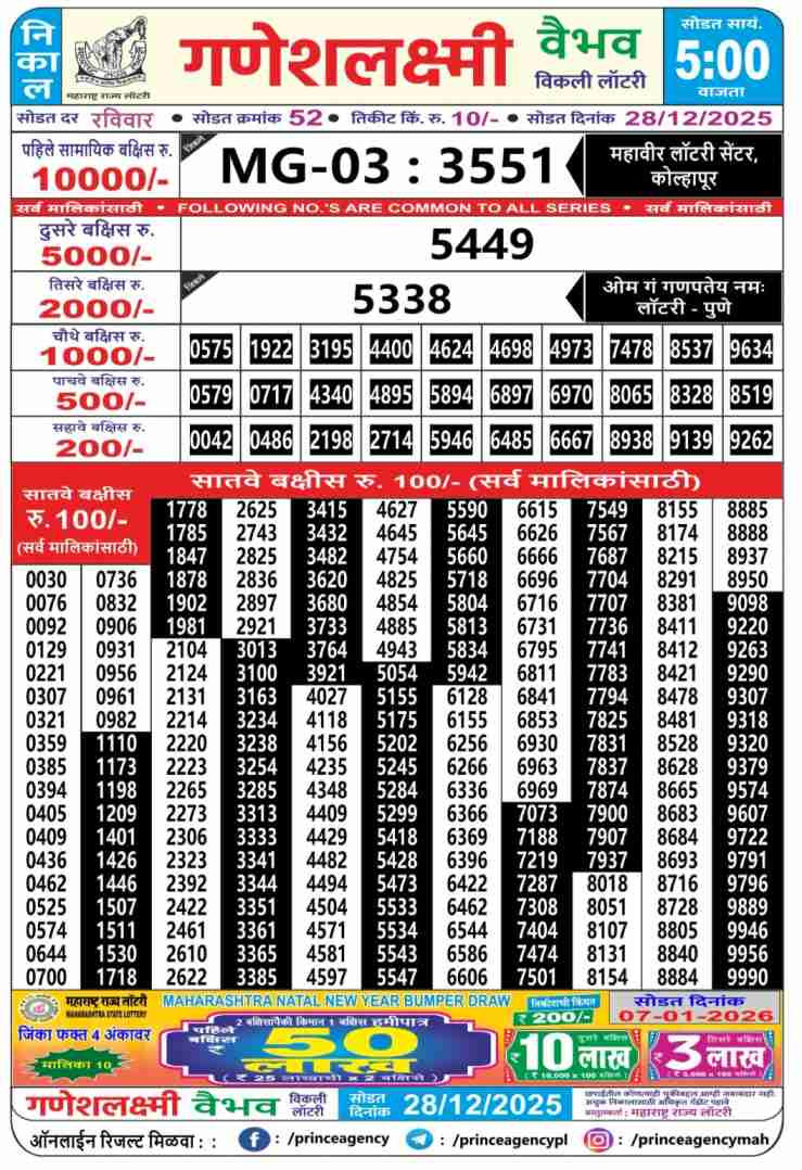 Maharashtra State Ganeshlaxmi Vaibhav Weekly Lottery ticket is only Maharashtra Weekly rupees 10 for 1 ticket, but 10 thousand is given as prize for winning the major. Results are also placed on this page which you can see Ganeshlaxmi Vaibhav Weekly Lottery Result today 28.12.2025 is searched by different names, Maharashtra State Ganeshlaxmi Vaibhav Weekly Lottery Result 05:00pm, Maharashtra State lottery 05:00pm result , Maharashtra State Lottery today Ganeshlaxmi Vaibhav Weekly lottery result, Maharashtra Ganeshlaxmi Vaibhav Lottery Result, Maharashtra State Ganeshlaxmi Vaibhav Weekly lottery result 2025, Ganeshlaxmi Vaibhav Weekly lottery result 05:00pm, Maharashtra State lottery 2025.