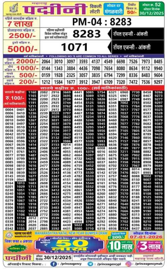 Maharashtra State Lottery declares many bumper results. Maharashtra Padmini 2025 Result is Maharashtra State Lottery at 04:15 PM whose result gets published on the page around 05:00 PM. Maharashtra State Padmini Weekly Lottery Result 30.12.2025 Live Draw Winner List at 4.15 PM, Maharashtra Dear Padmini Lottery 2025, Today Maharashtra Padmini Lottery, Maharashtra State Lottery Padmini Lottery Result Today Live, Maharashtra Padmini Draw 2025, Maharashtra Lottery Padmini Result 2025, Maharashtra Lottery 2025, Maharashtra State Lottery Result 2025, Maharashtra Padmini Lottery 30.12.2025 Result.