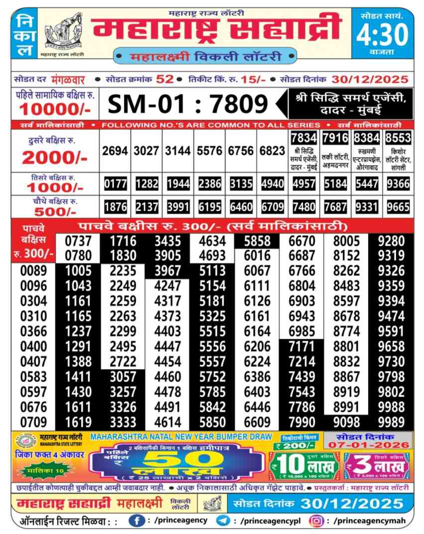 Maharashtra State Sahyadri Mahalaxmi Weekly Lottery ticket is only Maharashtra Sahyadri Weekly rupees 15 for 1 ticket, but 10 thousand is given as prize for winning the major. Results are also placed on this page which you can see Sahyadri Mahalaxmi Weekly Lottery Result today 30.12.2025 is searched by different names, Maharashtra State Sahyadri Mahalaxmi Weekly Lottery Result 4:30PM, Maharashtra State lottery 4:30PM result , Maharashtra State Lottery today Sahyadri Mahalaxmi Weekly lottery result, Maharashtra Sahyadri Mahalaxmi Lottery Result, Maharashtra State Sahyadri Mahalaxmi Weekly lottery result 2025, Sahyadri Mahalaxmi Weekly lottery result 4:30PM, Maharashtra State lottery 2025.