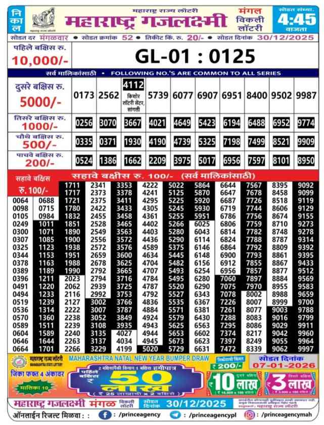 Maharashtra State Lottery 30.12.2025 Today Result is Maharashtra State Gajlaxmi Mangal Weekly Weekly lottery Result draw whose Maharashtra lottery result is published a day. Mainly Maharashtra State Lottery is 4:45 pm Maharashtra State Lottery but being combined with lottery sambad, Maharashtra State Lottery will release the results of 04:45pm is published.