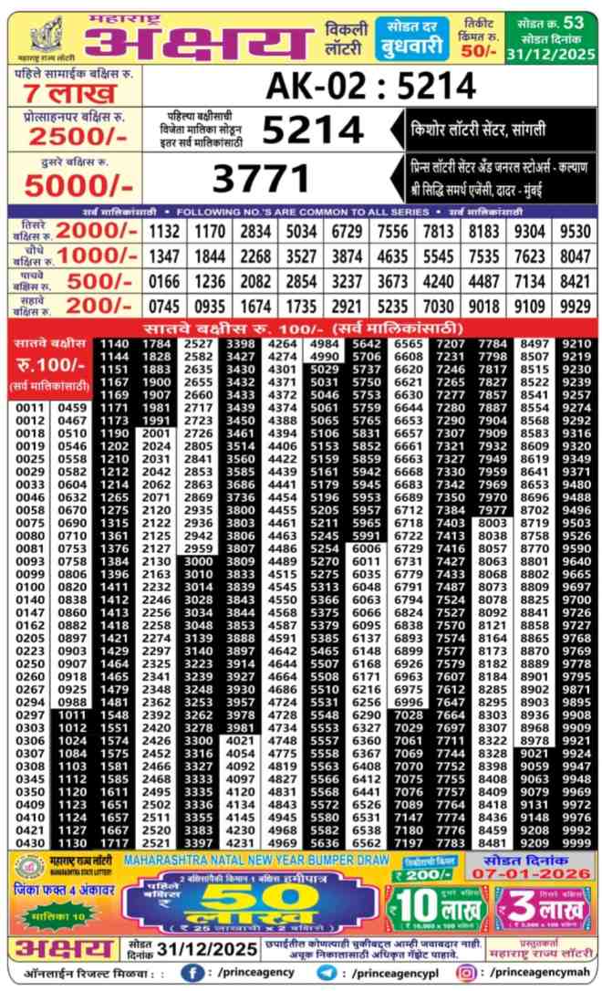 Maharashtra State 31.12.2025 AKSHAY Weekly Lottery Result Today Live 04:15 PM