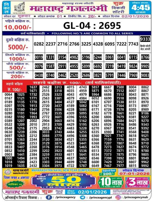 Maharashtra State Lottery 2.1.2026 Today Result is Maharashtra State Gajlaxmi Shukra Weekly Weekly lottery Result draw whose Maharashtra lottery result is published a day. Mainly Maharashtra State Lottery is 4:45 pm Maharashtra State Lottery but being combined with lottery sambad, Maharashtra State Lottery will release the results of 04:45pm is published.