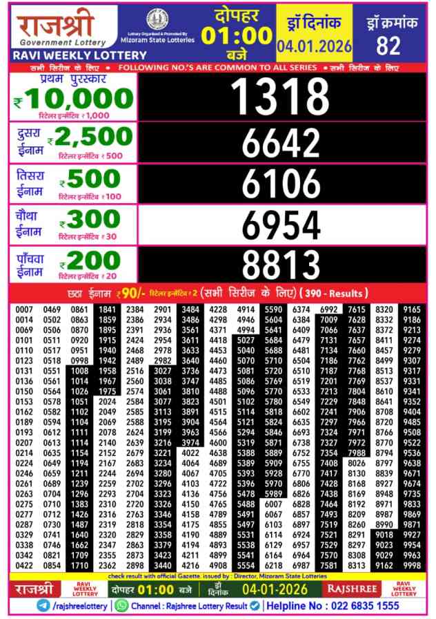Download Mizoram Rajshree Lottery Ravi 4.1.2026 Today 01:00PM Result from here. Mizoram Rajshree Weekly Lottery Result Important Lottery of Mizoram Rajshree which is legally operated by the Rajshree Government there. You are satisfied to Get The Result of Ravi weekly Lottery at 01:00PM on this webpost Today’s Lottery Result of Mizoram Rajshree Lottery 01:00PM is published here.