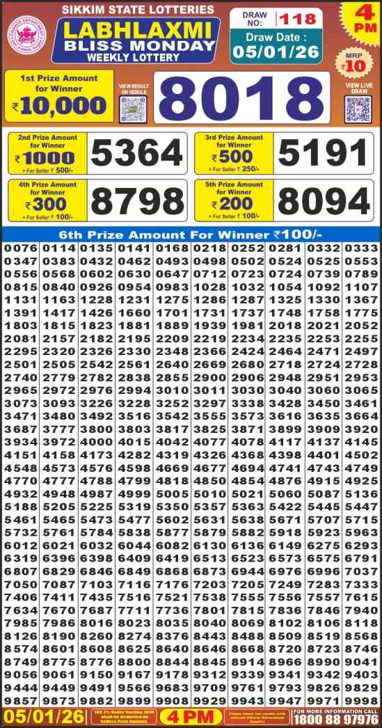 Sikkim State Labh laxmi Bliss Monday Lottery ticket is only Labh laxmi Bliss rupees for 1 ticket, but 10,000 is given as prize for winning the major. Results are also placed on this page which you can see Labh laxmi Bliss Monday Lottery Result today 5.1.2026 is searched by different names, Sikkim State Labh laxmi Bliss Lottery Result 4PM, Sikkim State lottery 4PM result , Sikkim State Lottery today Labh laxmi Bliss lottery result, Sikkim Labh laxmi Monday Lottery Result, Sikkim State Labh laxmi Bliss Monday lottery result 2026, Labh laxmi Bliss lottery result 4PM, Sikkim State lottery 2026.