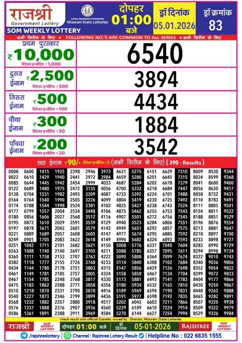| Mizoram Rajshree Som Weekly Lottery Result Today Live 5.1.2026 | |