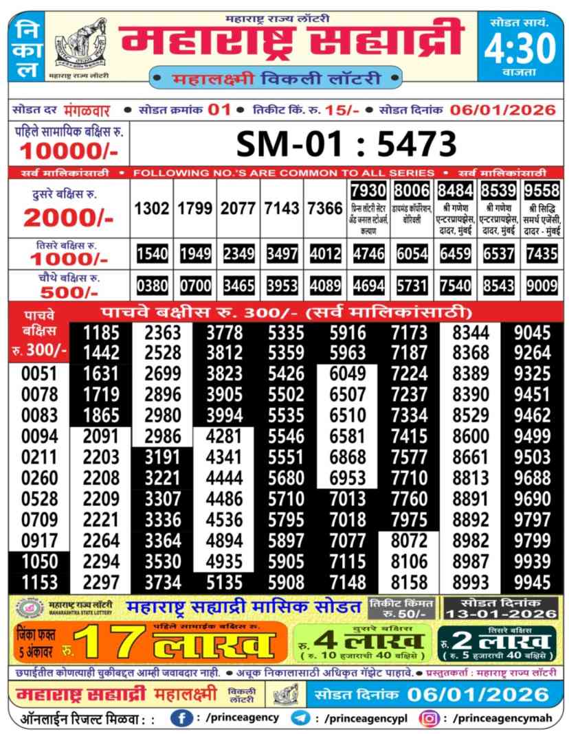 Maharashtra State Lottery 6.1.2026 Today Result is Maharashtra State Sahyadri Mahalaxmi Weekly Weekly lottery Result draw whose Maharashtra lottery result is published a day. Mainly Maharashtra State Lottery is 4:30 pm Maharashtra State Lottery but being combined with lottery sambad, Maharashtra State Lottery will release the results of 04:30PM is published.