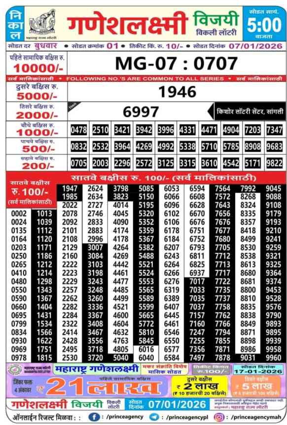 Maharashtra State Ganeshlaxmi Vijayi Weekly Lottery ticket is only Maharashtra Weekly rupees 10 for 1 ticket, but 10 thousand is given as prize for winning the major. Results are also placed on this page which you can see Ganeshlaxmi Vijayi Weekly Lottery Result today 6.1.2026 is searched by different names, Maharashtra State Ganeshlaxmi Vijayi Weekly Lottery Result 05:00pm, Maharashtra State lottery 05:00pm result , Maharashtra State Lottery today Ganeshlaxmi Vijayi Weekly lottery result, Maharashtra Ganeshlaxmi Vijayi Lottery Result, Maharashtra State Ganeshlaxmi Vijayi Weekly lottery result 2026, Ganeshlaxmi Vijayi Weekly lottery result 05:00pm, Maharashtra State lottery 2026.