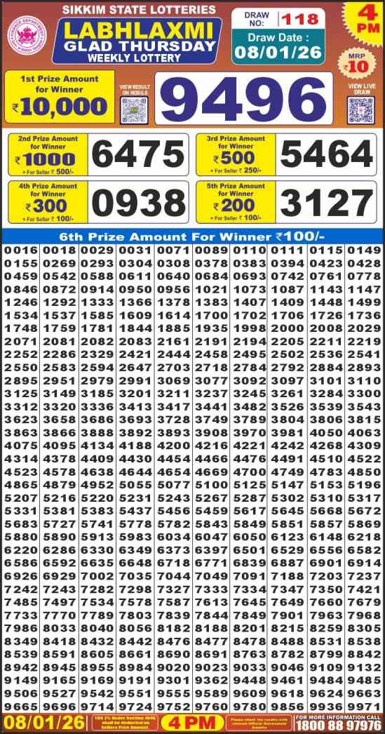 Sikkim State Lottery declares many bumper results. Labh laxmi Thursday Weekly Lottery Result 8.1.2026 is Sikkim State Lottery at 04:00 PM whose result gets published on the page around 04:12 PM. Sikkim State Lottery Result , Labh laxmi Glad Result, Labh laxmi Thursday Result Today Live 4PM, Sikkim Labh laxmi Weekly Result 4PM, Sikkim State Labh laxmi Glad Thursday Result, Sikkim State lottery result 4PM, Labh laxmi Thursday Weekly Result 8.1.2026, Labh laxmi Glad result, Sikkim Labh laxmi 4 PM Result, Sikkim lottery result today 4PM, Labh laxmi Thursday Lottery 4 PM result , Sikkim Labh laxmi Thursday Weekly Lottery Result, Sikkim Labh laxmi Thursday Live 8.1.2026 Draw.