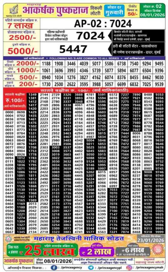 Maharashtra State Akarshak Pushkraj lottery ticket is only 50 rupees for 1 ticket, but 7 Lakh Rupees is given as prize for winning the major. Results are also placed on this page which you can see Maharashtra Akarshak Pushkrajr Result Today 8.1.2026 is searched by different names, Maharashtra State Akarshak Pushkraj Weekly 2026, Maharashtra Akarshak Pushkraj Weekly Lottery Result 2026, Maharashtra Akarshak Pushkraj Lottery Result 8.1.2026 Live Result 4:15 PM, Maharashtra Akarshak Pushkraj Lottery Result 8.1.2026, Dear Maharashtra Akarshak Pushkraj PDF Result, Today Live Maharashtra Akarshak Pushkraj Weekly Lottery Result, Maharashtra State Akarshak Pushkraj Weekly 2026 Draw, Maharashtra State Akarshak Pushkraj Weekly Lottery Result.
