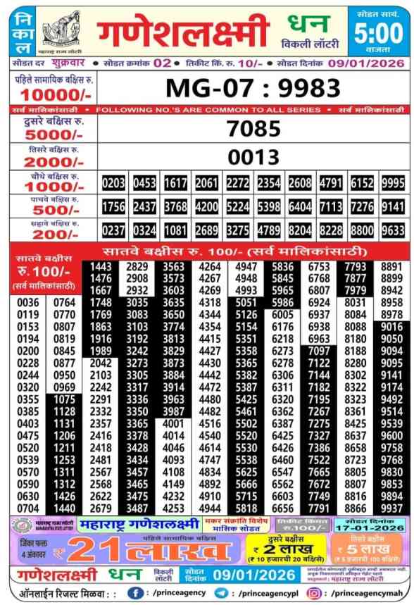 | Maharashtra Ganeshlaxmi Dhan Weekly Lottery Result Today Live 9.1.2026 | |