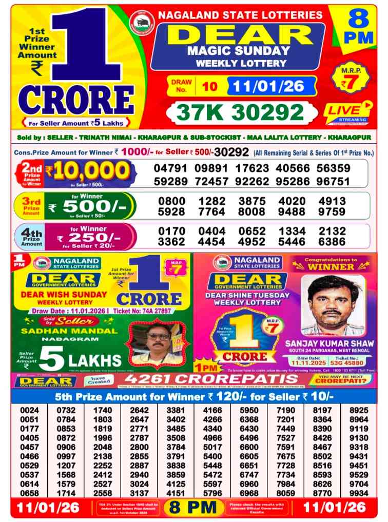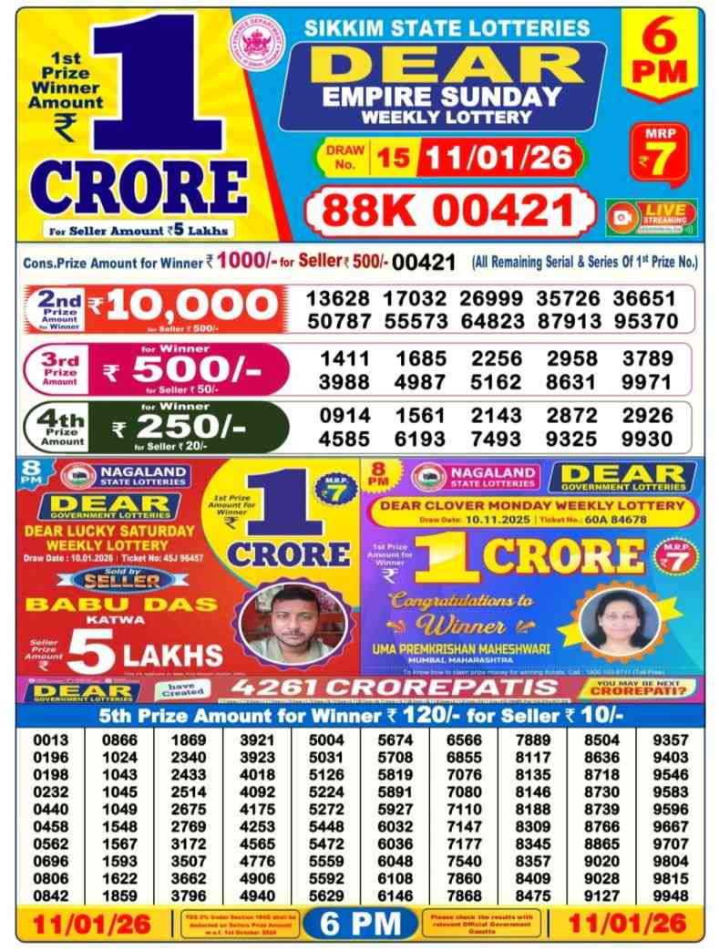 Nagaland State Lotteries Today Live draw Lottery Sambad Lottery Result 6pm. Dear Lottery Result will be presented today at 6pm on Lottery Sambad. Which is combined through West Bengal State Lottery. Lottery Sambad 11.1.2026 Lottery Result, Lottery Sambad 11.1.2026 Eveving Result 6pm, Dear Evening Lottery Sambad Result 11.1.2026. Dear Lottery Result 11.1.2026, Nagaland State Lottery Sambad Result Today 6pm, Today Live Lottery Sambad 11.1.2026, Lottery Sambad Live Today Result, Dear Sikkim State Lottery Evening Result, Sikkim Lottery Sambad Result 11.1.2026, Sikkim State Lottery 6pm Result Today Live.