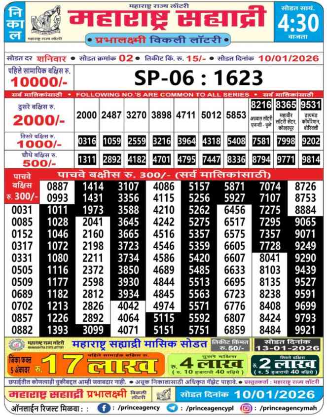 | Maharashtra State Sahyadri Prabhalaxmi Weekly Lottery 10.1.2026 Result | Maharashtra State Lottery 4:30PM Result | Maharashtra State Sahyadri Prabhalaxmi Weekly Lottery Result Today 4:30PM| Maharashtra State Lottery Result 4:30PM Today Live Draw | Maharashtra State Lottery | Check Maharashtra Sahyadri Prabhalaxmi Weekly Weekly Lottery Result | |