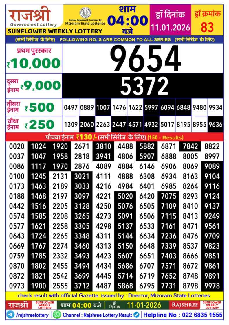 Download Mizoram Rajshree Lottery Sunflower ravi 11.1.2026 Today 04:00PM Result from here. Mizoram Rajshree Sunflower Weekly Lottery Result Important Lottery of Mizoram Rajshree which is legally operated by the Rajshree Government there. You are satisfied to Get The Result of Sunflower ravi weekly Lottery at 004:00PM on this webpost Today’s Lottery Result of Mizoram Rajshree Lottery 04:00PM is published here.