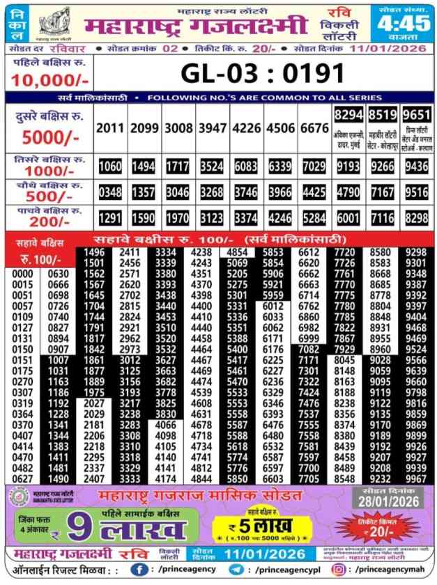 Maharashtra State Lottery 11.1.2026 Today Result is Maharashtra State Gajlaxmi Ravi Weekly Weekly lottery Result draw whose Maharashtra lottery result is published a day. Mainly Maharashtra State Lottery is 4:45 pm Maharashtra State Lottery but being combined with lottery sambad, Maharashtra State Lottery will release the results of 04:45pm is published.