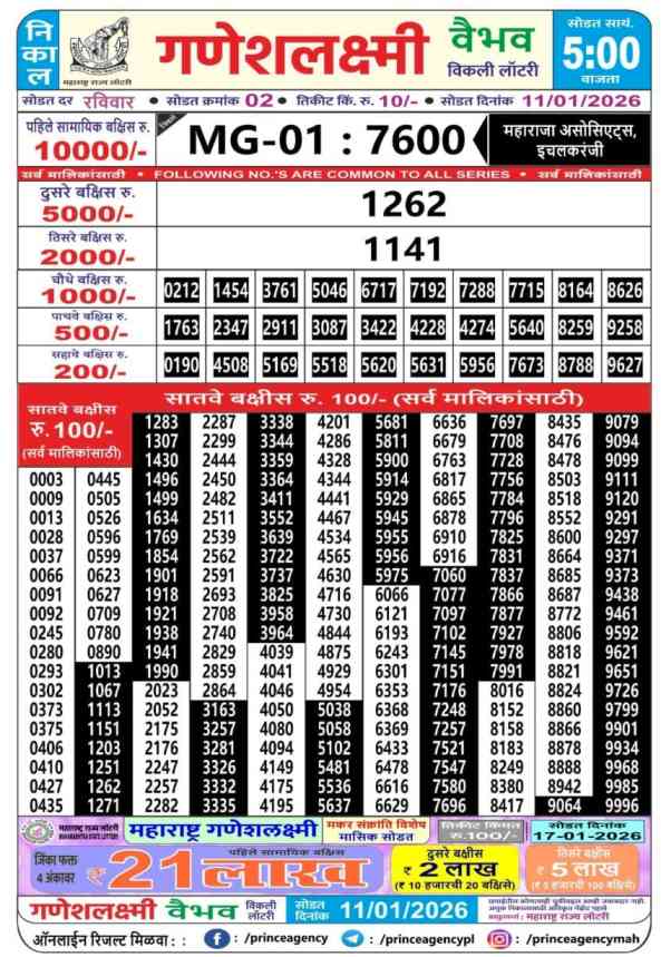 Maharashtra State Ganeshlaxmi Vaibhav Weekly Lottery ticket is only Maharashtra Weekly rupees 10 for 1 ticket, but 10 thousand is given as prize for winning the major. Results are also placed on this page which you can see Ganeshlaxmi Vaibhav Weekly Lottery Result today 11.1.2026 is searched by different names, Maharashtra State Ganeshlaxmi Vaibhav Weekly Lottery Result 05:00pm, Maharashtra State lottery 05:00pm result , Maharashtra State Lottery today Ganeshlaxmi Vaibhav Weekly lottery result, Maharashtra Ganeshlaxmi Vaibhav Lottery Result, Maharashtra State Ganeshlaxmi Vaibhav Weekly lottery result 2026, Ganeshlaxmi Vaibhav Weekly lottery result 05:00pm, Maharashtra State lottery 2026.
