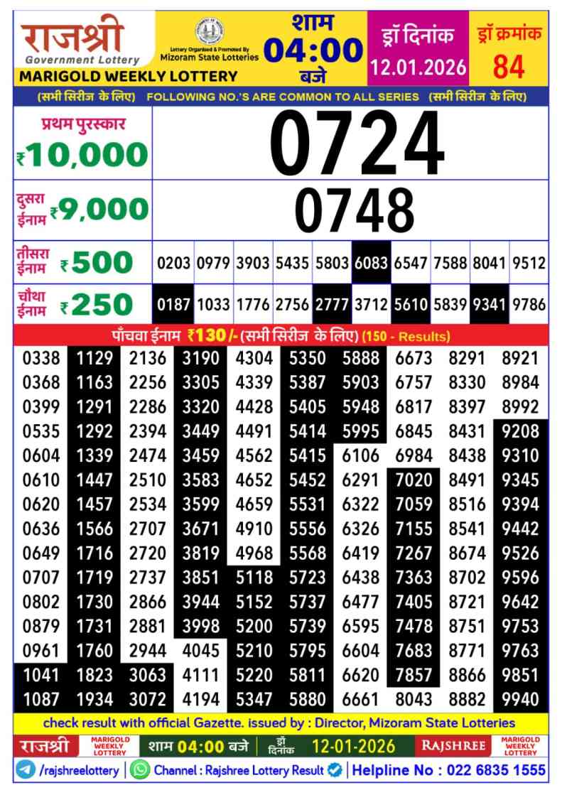 Goa Rajshree Lottery declares many bumper results. Today Rajshree Marigold Lottery Result 2026 is Goa Rajshree Lottery at 03:30 PM whose result gets published on the page around 04:12 PM. Goa Rajshree Lottery Result ,12.1.2026 Marigold Som Result, Rajshree Marigold Result Today Live 4:00PM, Goa Rajshree Marigold Som Weekly Result, Goa Rajshree Lottery Result 4:00PM, Goa Marigold Som Result 3:30 PM, Goa Lottery Result Today 4:00PM, Rajshree Marigold Weekly Lottery 3:30 PM Result 12.1.2026.