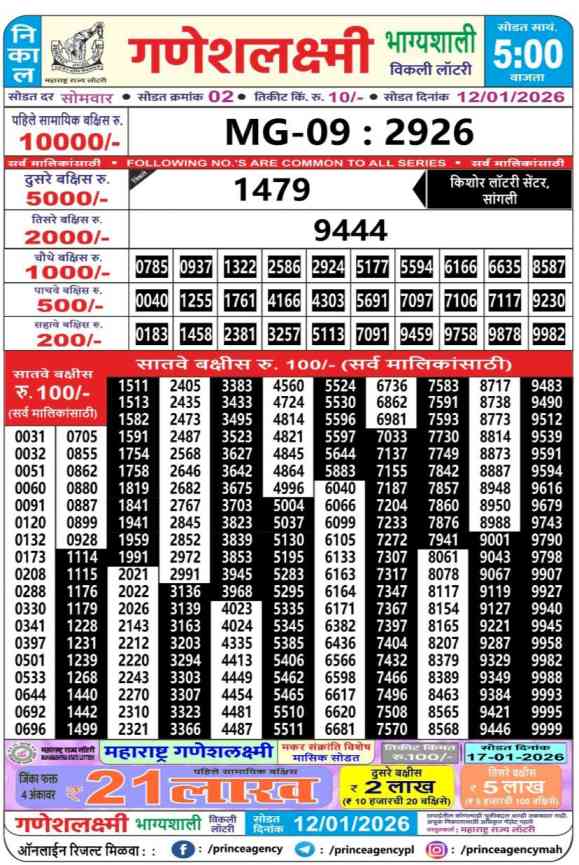 | Maharashtra State Ganeshlaxmi Bhagyashali Weekly Lottery 12.1.2026 Result | Maharashtra State Lottery 5PM Result | Maharashtra State Ganeshlaxmi Bhagyashali Weekly Lottery Result Today 5:00PM| Maharashtra State Lottery Result 05:00PM Today Live Draw | Maharashtra State Lottery | Check Maharashtra Ganeshlaxmi Bhagyashali Weekly Weekly Lottery Result | |