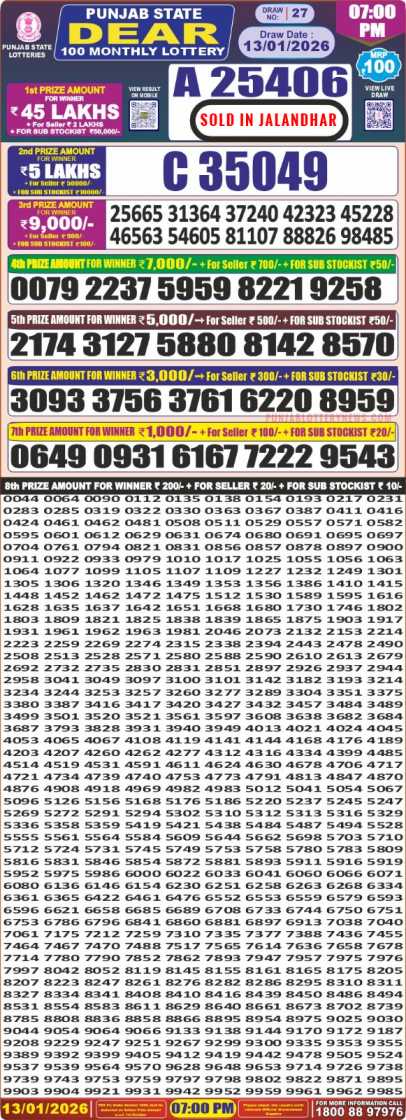 Here you can download Punjab State Dear 100 Monthly 13.1.2026 Today 6pm Result. Punjab State Dear 100 Monthly Lottery Result Today important Lottery of Punjab State which is legally operated by the State Government.Dear 100 Monthly Lottery at 06:00PM on this webpost Today’s Lottery Result of Punjab State Lottery 6pm is published.