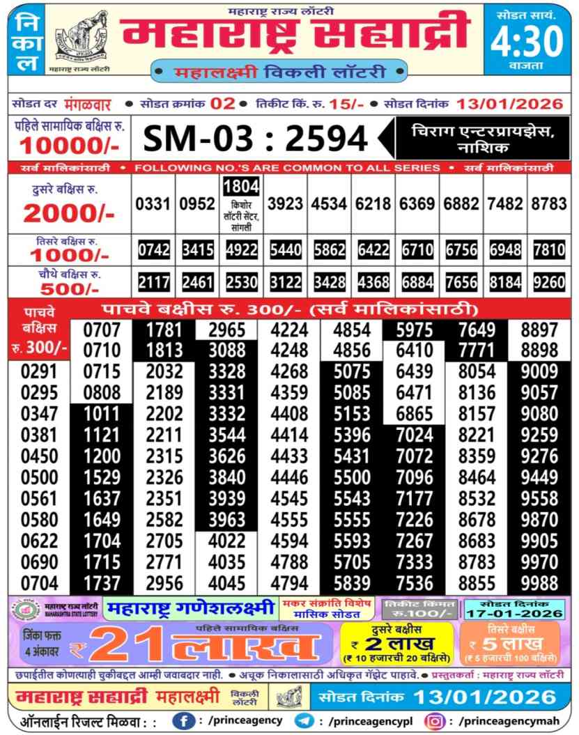 | Maharashtra State Sahyadri Mahalaxmi Weekly Lottery 13.1.2026 Result | Maharashtra State Lottery 4:30PM Result | Maharashtra State Sahyadri Mahalaxmi Weekly Lottery Result Today 4:45PM| Maharashtra State Lottery Result 4:30PM Today Live Draw | Maharashtra State Lottery | Check Maharashtra Sahyadri Mahalaxmi Weekly Weekly Lottery Result | |