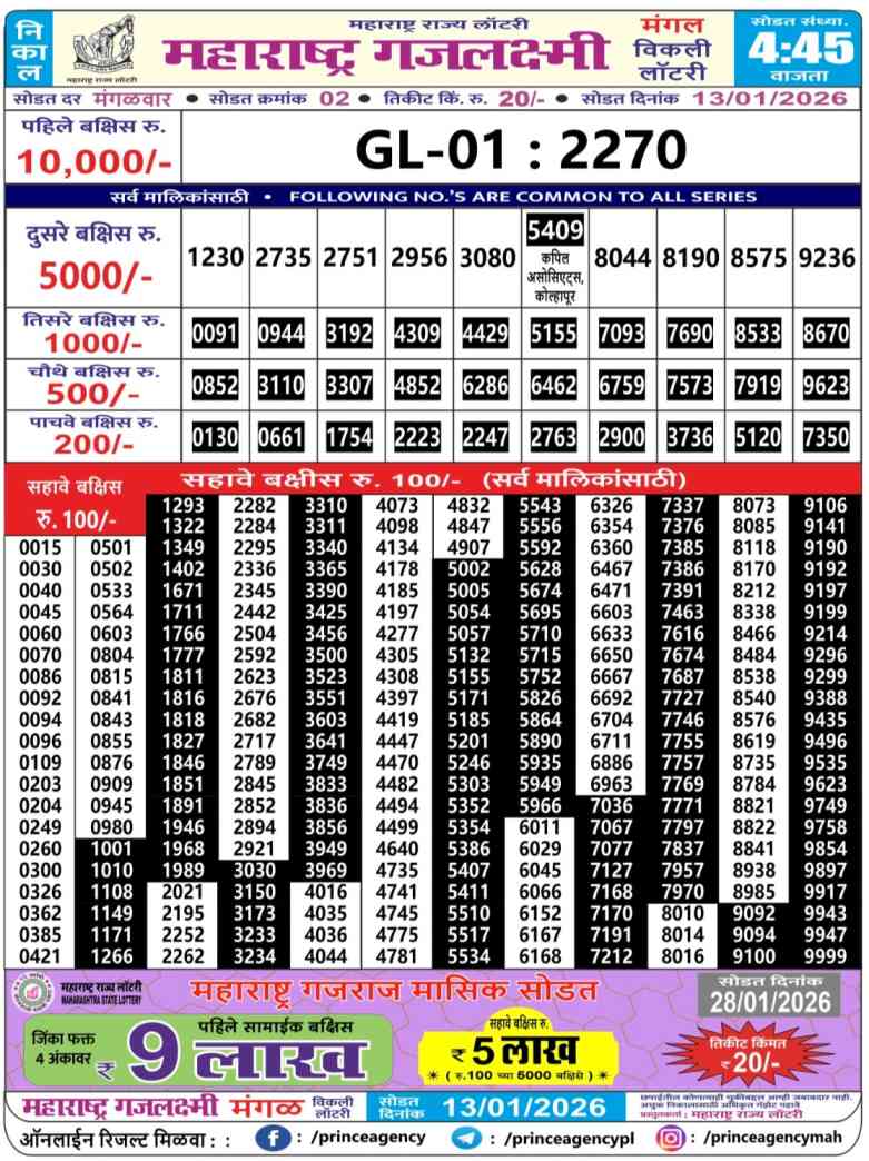Maharashtra State Gajlaxmi Mangal Lottery 4:45 PM Result 13.1.2026