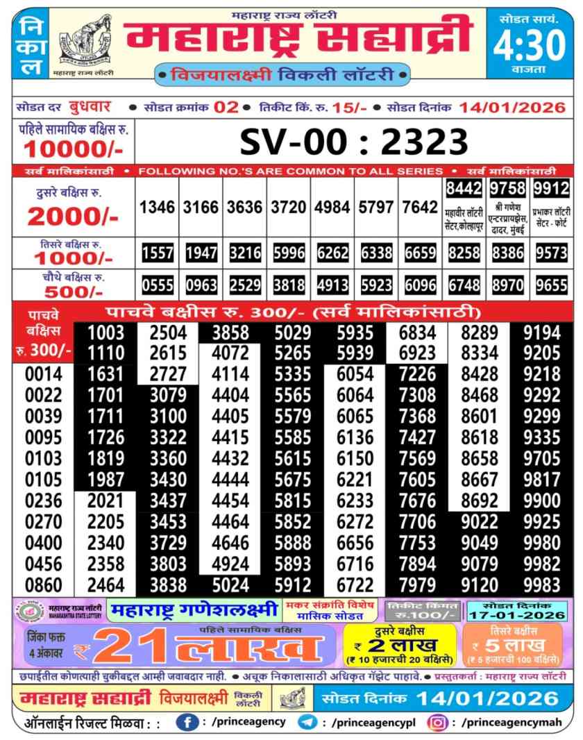 | Maharashtra State Sahyadri Mahalaxmi Weekly Lottery 14.1.2026 Result | Maharashtra State Lottery 4:30PM Result | Maharashtra State Sahyadri Mahalaxmi Weekly Lottery Result Today 4:45PM| Maharashtra State Lottery Result 4:30PM Today Live Draw | Maharashtra State Lottery | Check Maharashtra Sahyadri Mahalaxmi Weekly Weekly Lottery Result | |
