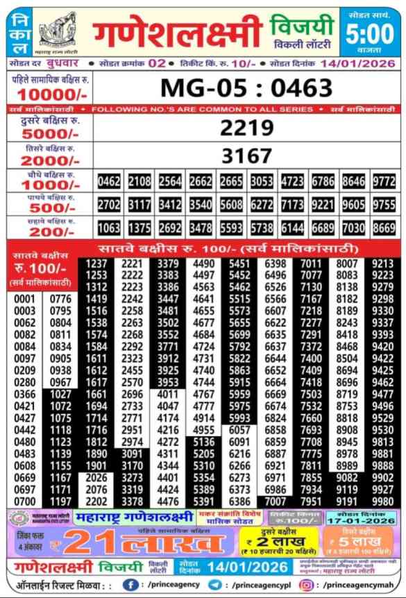 Maharashtra State Ganeshlaxmi Vijayi Weekly Lottery ticket is only Maharashtra Weekly rupees 10 for 1 ticket, but 10 thousand is given as prize for winning the major. Results are also placed on this page which you can see Ganeshlaxmi Vijayi Weekly Lottery Result today 14.1.2026 is searched by different names, Maharashtra State Ganeshlaxmi Vijayi Weekly Lottery Result 05:00pm, Maharashtra State lottery 05:00pm result , Maharashtra State Lottery today Ganeshlaxmi Vijayi Weekly lottery result, Maharashtra Ganeshlaxmi Vijayi Lottery Result, Maharashtra State Ganeshlaxmi Vijayi Weekly lottery result 2026, Ganeshlaxmi Vijayi Weekly lottery result 05:00pm, Maharashtra State lottery 2026.