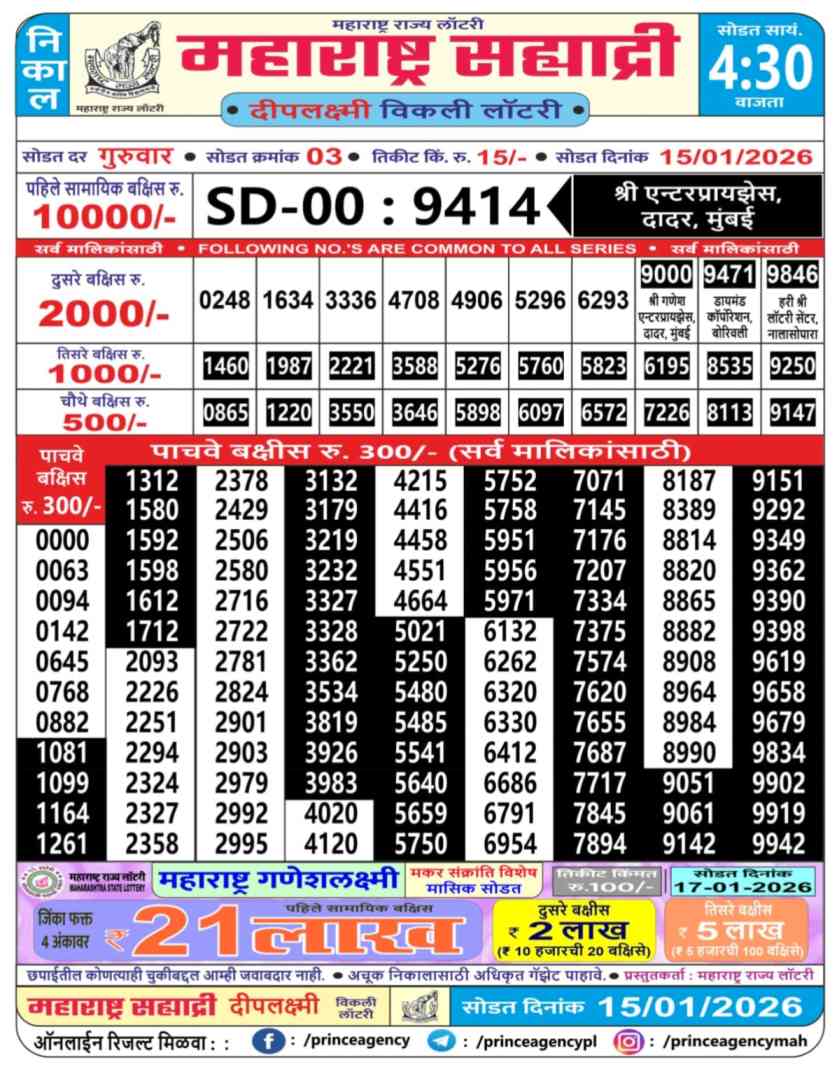 Maharashtra State Sahyadri Deeplaxmi Weekly Lottery 15.1.2026 Result |  Maharashtra State Lottery 4:30pm Result | Maharashtra State Sahyadri Deeplaxmi Weekly Lottery Result Today 04:30pm| Maharashtra State Lottery Result 04:30pm Today Live Draw | Maharashtra State Lottery | Check Maharashtra Sahyadri Deeplaxmi Weekly Weekly Lottery Result