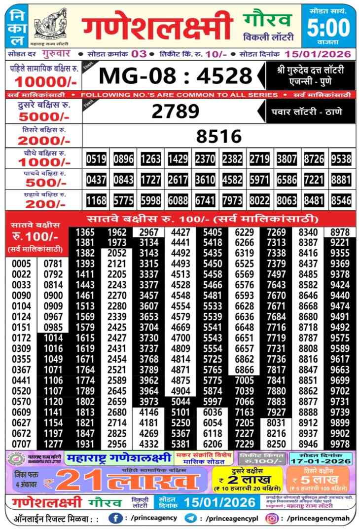 Maharashtra State Ganeshlaxmi Gaurav Weekly Lottery ticket is only Maharashtra Weekly rupees 10 for 1 ticket, but 10 thousand is given as prize for winning the major. Results are also placed on this page which you can see Ganeshlaxmi Gaurav Weekly Lottery Result today 15.1.2026 is searched by different names, Maharashtra State Ganeshlaxmi Gaurav Weekly Lottery Result 05:00pm, Maharashtra State lottery 05:00pm result , Maharashtra State Lottery today Ganeshlaxmi Gaurav Weekly lottery result, Maharashtra Ganeshlaxmi Gaurav Lottery Result, Maharashtra State Ganeshlaxmi Gaurav Weekly lottery result 2026, Ganeshlaxmi Gaurav Weekly lottery result 05:00pm, Maharashtra State lottery
