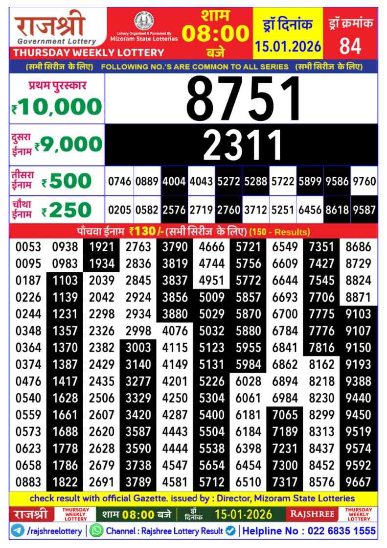 | Mizoram Rajshree Thursday Weekly Lottery Result Today Live 15.1.2026 | |
