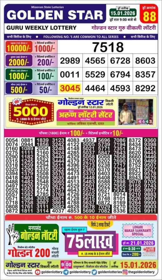 | Mizoram Golden Star Guru Weekly Lottery Result Today Live 15.1.2026 | |